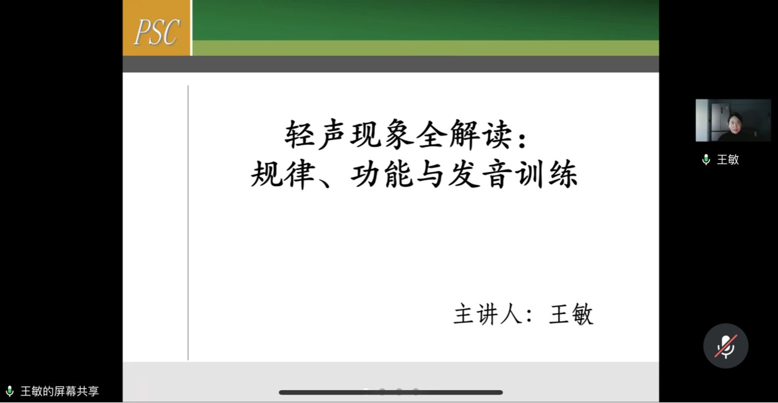 讲座过程中,王敏系统梳理了轻声教学的理论框架与实践方法。首先明确了轻声在普通话语音体系中的地位,继而从语音学角度深入解析轻声音节在音高、音长、音色、音强等方面的变化规律,将必读与可轻读词语归纳为“有规律”和“约定俗成”两类,并结合语法功能阐明使用规则,特别强调了重叠形容词在口语中的变调适用情境。