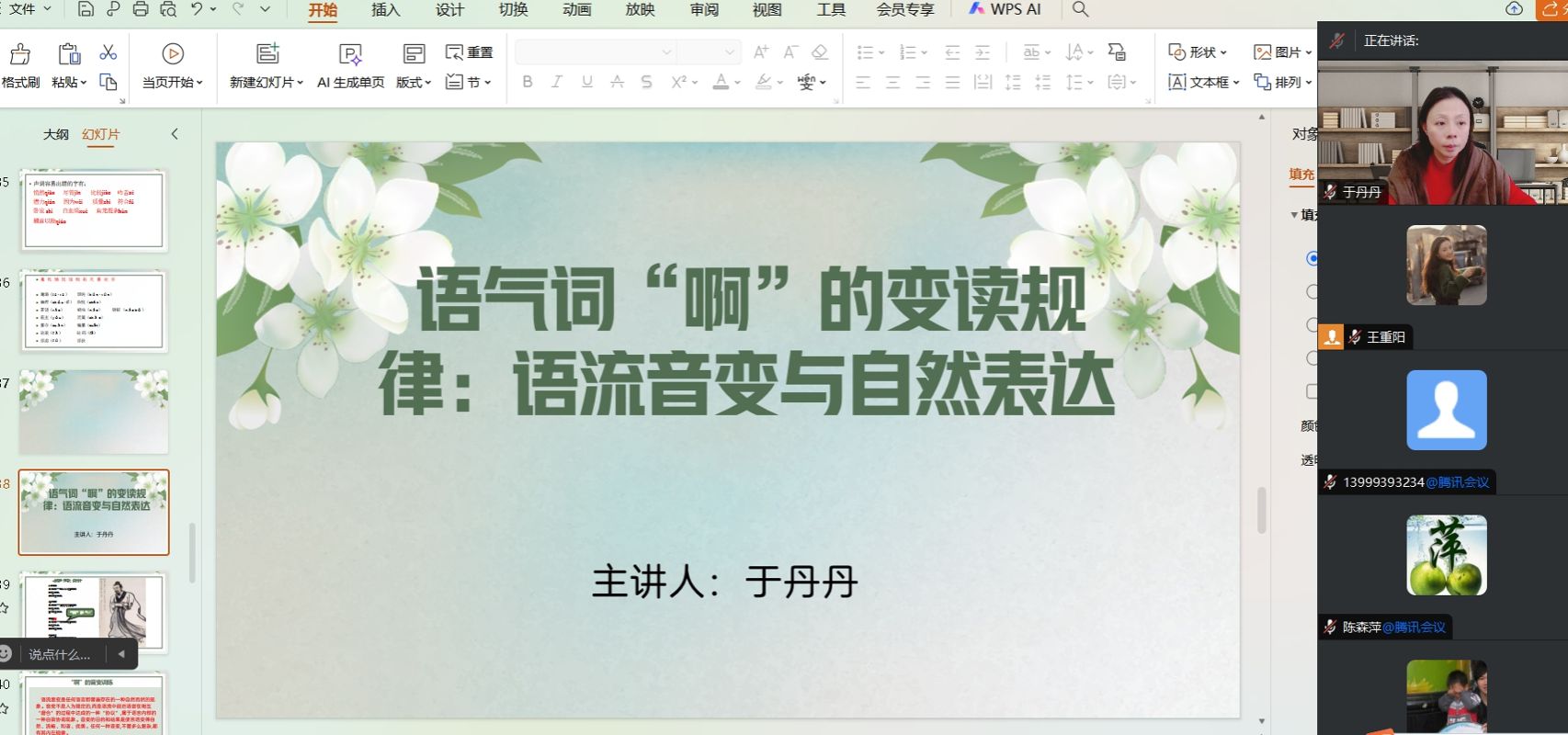 讲座紧扣普通话水平测试要求,以语气词“啊”的变读规律为核心,结合民族地区幼儿普通话教学的实际需求,系统解析语流音变的发音逻辑。她通过丰富的实例分析、发音示范,清晰讲解不同语境下“啊”的变读技巧与自然表达方法,并将音变教学与幼儿日常活动场景相结合,提出“趣味化”“情境化”的教学实施路径,为一线教师提供了解决发音教学难点的具体方案。
