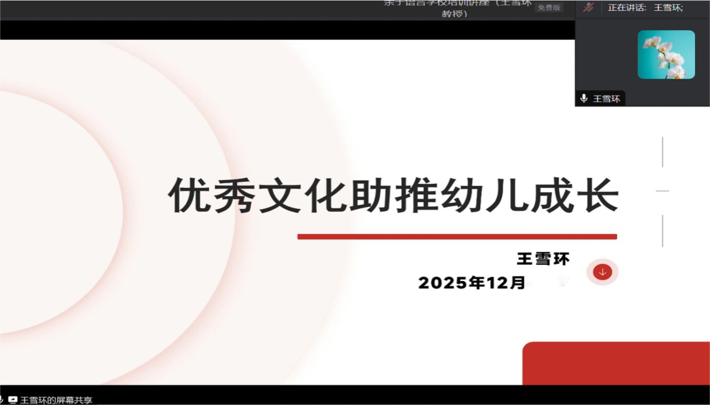2025年12月21日上午,我校国家语言文字推广基地成功举办“百园千师万家工程”家长学校系列讲座第四讲。本次讲座以“优秀文化融入幼儿语言教育”为主题,通过线上平台面向全国尤其是东西部地区幼儿家长开展,旨在为不同地域家庭提供具有文化包容性与实践指导性的语言教育支持。讲座由基地教师于丹丹主持,吸引多地家长积极参与,反响热烈。